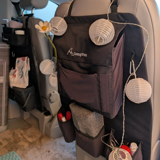 Unser Rückenlehnenorganizer, der ordentlich was schluckt! Verstaue dein Equipment endlich so, dass du es immer griffbereit hast, durch die große Toploader-Tasche selbst bei gedrehtem Sitz. Nachhaltig, robust und passgenau - ein Must-Have für deinen Van!