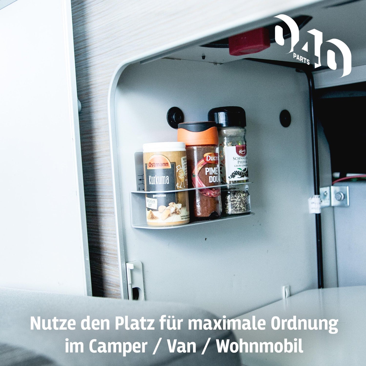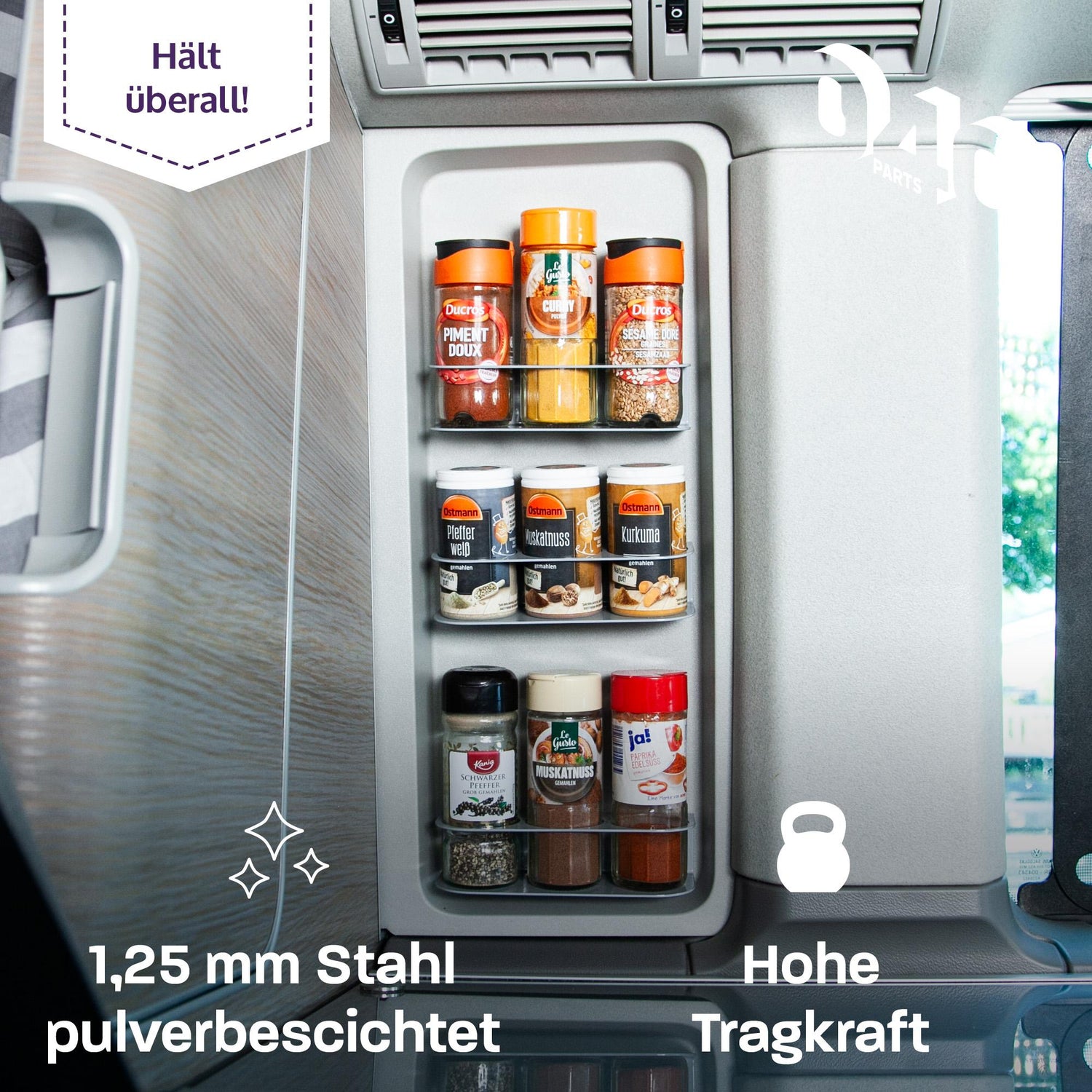Die Montage ist kinderleicht: Klebe das Regal einfach in die kleine Verdunkelung neben dem Schrank im California und schon sind deine Gewürze immer griffbereit. In anderen Fahrzeugen oder in der Küche kannst du die Gewürzhalter beliebig anbringen und bei Bedarf wieder ablösen.