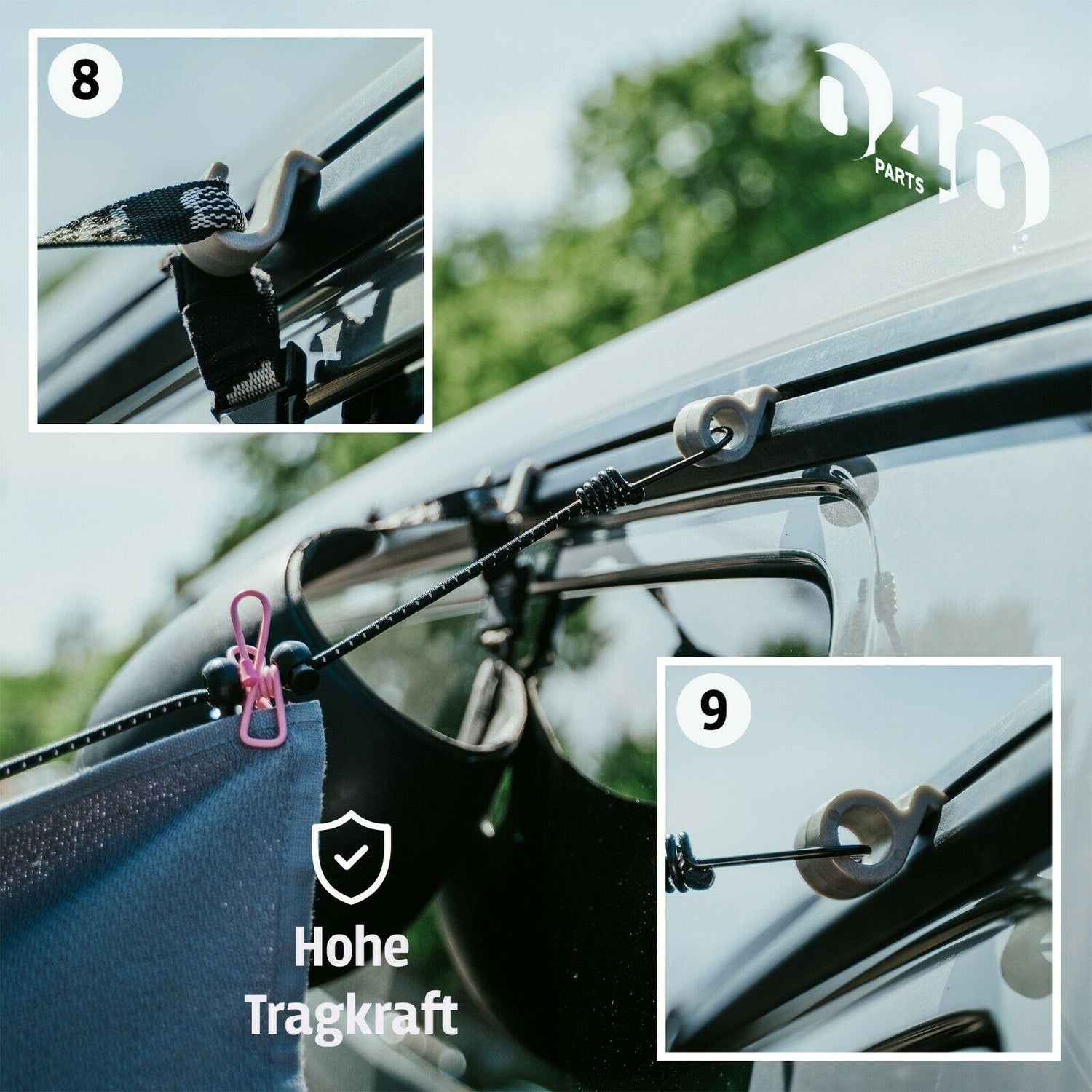 PERFEKTE PASSFORM: Alle Haken wurden speziell für VW T5, T6, T6.1 California Modelle entwickelt und können mühelos an den vorgesehenen Halterungen angebracht werden.